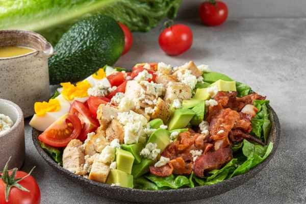 Avocado, bacon, grilled chicken, shredded, cheddar cheese, onions, tomatoes, and cucumbers