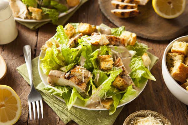 Crisp romaine lettuce tossed in creamy Caesar dressing, topped with juicy grilled chicken, crunchy croutons, and shredded Parmesan
