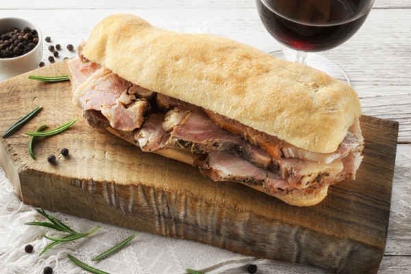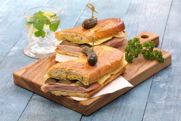 Ham, roasted pork, Swiss cheese, pickles, and mustard on crispy bread.