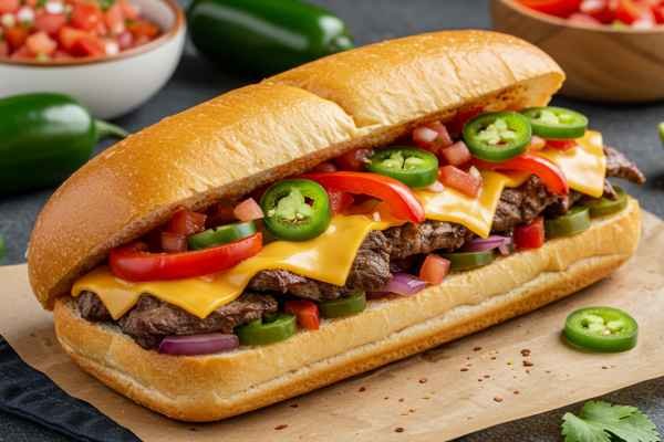 Juicy, tender slices of seasoned steak piled high on a toasted roll, topped with melted cheese, fresh lettuce, tomatoes, and your choice of sauces.